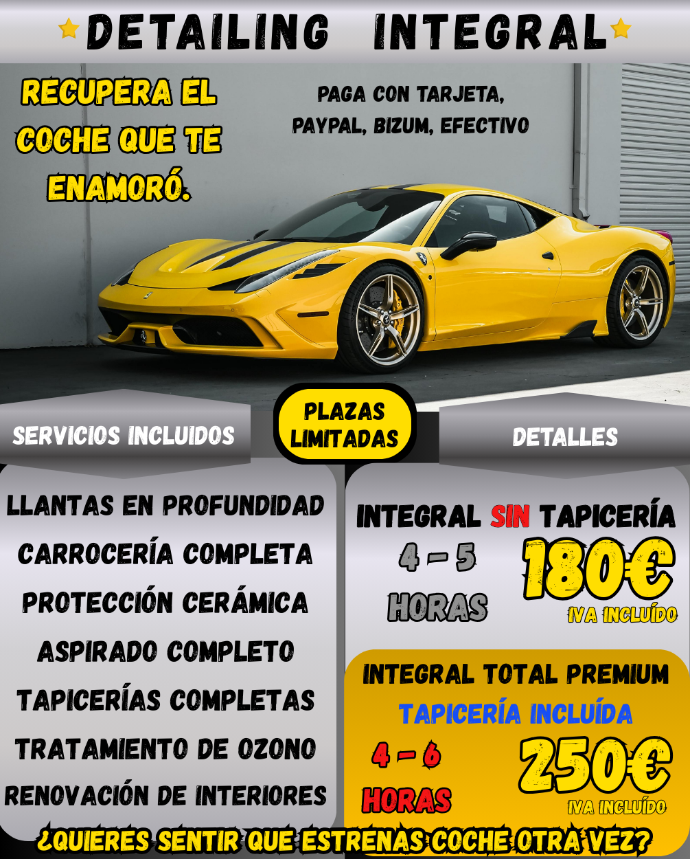 Transformamos tu coche sin que tengas que moverlo. Elige entre limpieza completa sin tapicería o el tratamiento premium total con tapicería incluida.